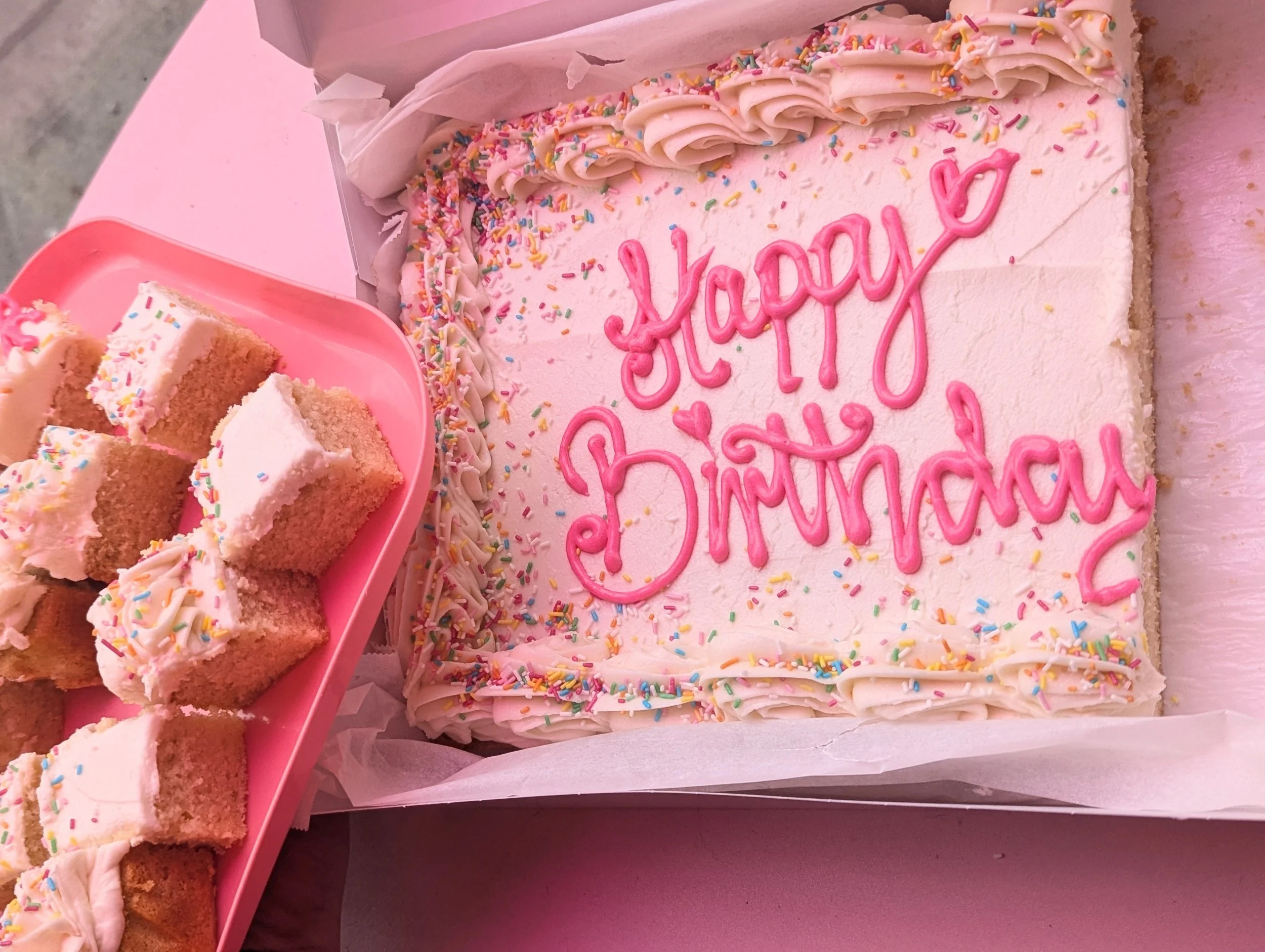 A single layer of our signature Vanilla sponge topped with fluffy vanilla frosting and sprinkles, add a message on top for no extra charge, Size: 12” x 9” Provides up to 36 small cubes
