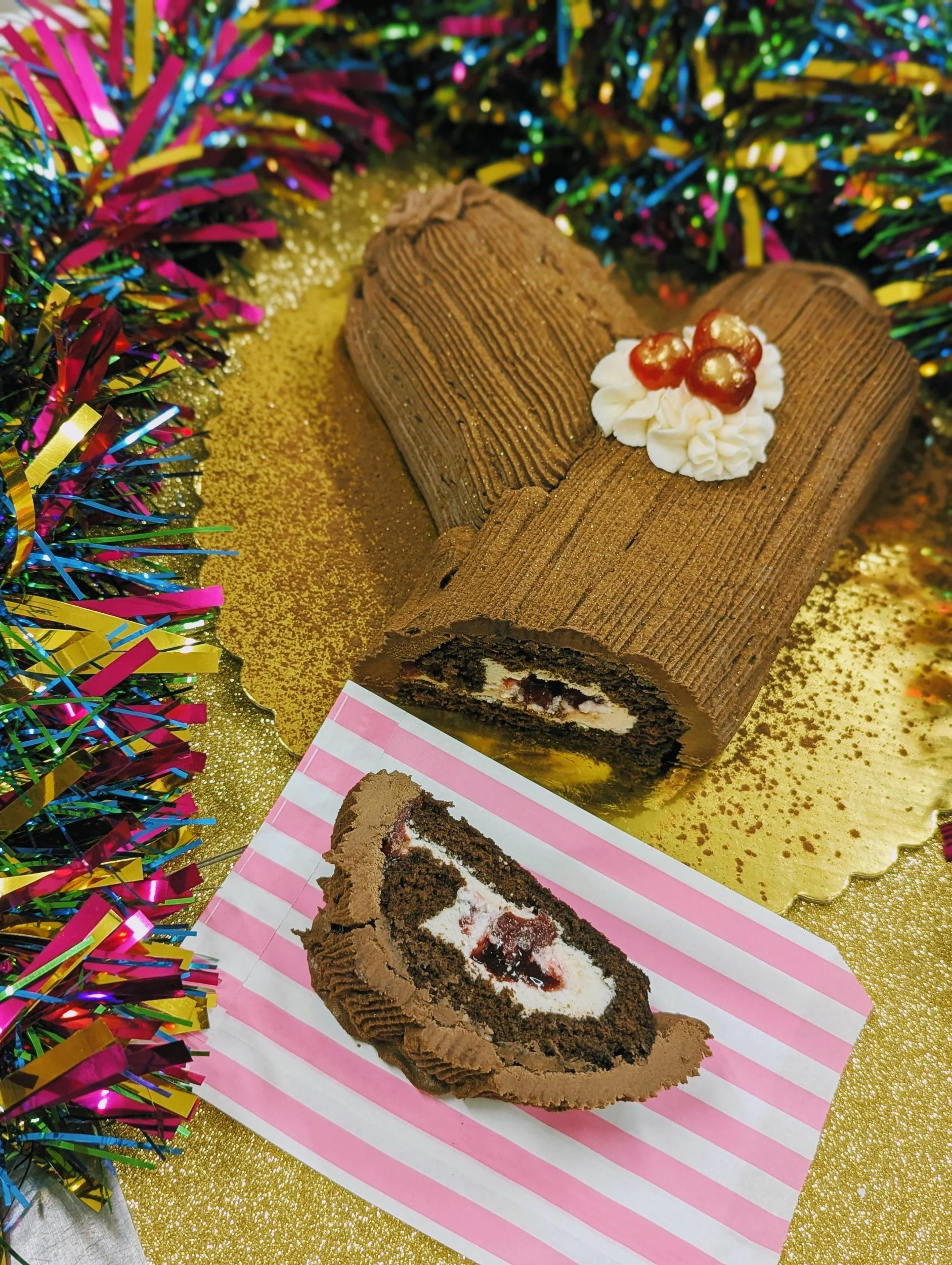 An alternative to the traditional Yule! Soft chocolate sponge cake carefully rolled with a smooth vanilla filling and black cherry compote. Topped generously with smooth chocolate frosting and a dusting of cocoa powder, it presents an ideal xmas dessert that’s perfect to share and enjoy with family and friends during the festive season.